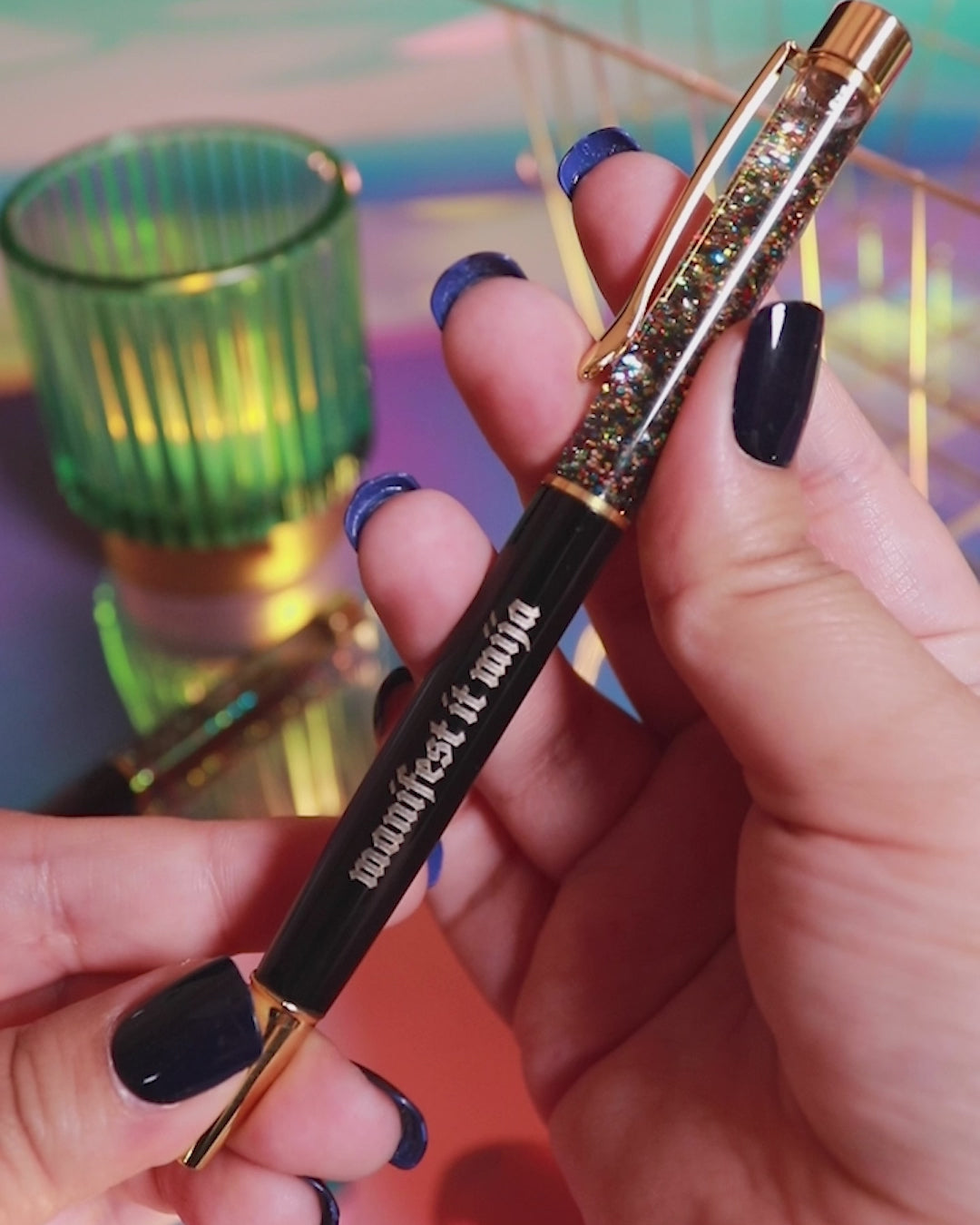Set of 3 black and gold ballpoint pens with glitter accents. Each pen is embossed with one of the below phrases: